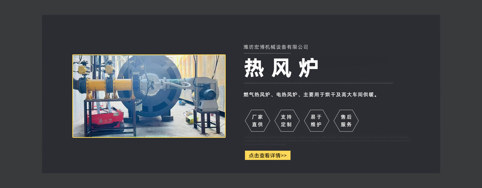 濰坊宏博機(jī)(jī)械設(shè)(shè)備有限公司是從事熱風(fēng)(fēng)爐、烘干設(shè)(shè)備、供暖設(shè)(shè)備的研發(fā)(fā)、設(shè)(shè)計(jì)、制造和服務(wù)(wù)于一體的實(shí)體企業(yè)(yè)。長(zhǎng)期以來,企業(yè)(yè)以市場(chǎng)的發(fā)(fā)展和客戶的需求為導(dǎo)(dǎo)向,集多年的生產(chǎn)(chǎn)技術(shù)(shù)與經(jīng)(jīng)驗(yàn)為一體,不斷開發(fā)(fā)和優(yōu)(yōu)良產(chǎn)(chǎn)品。